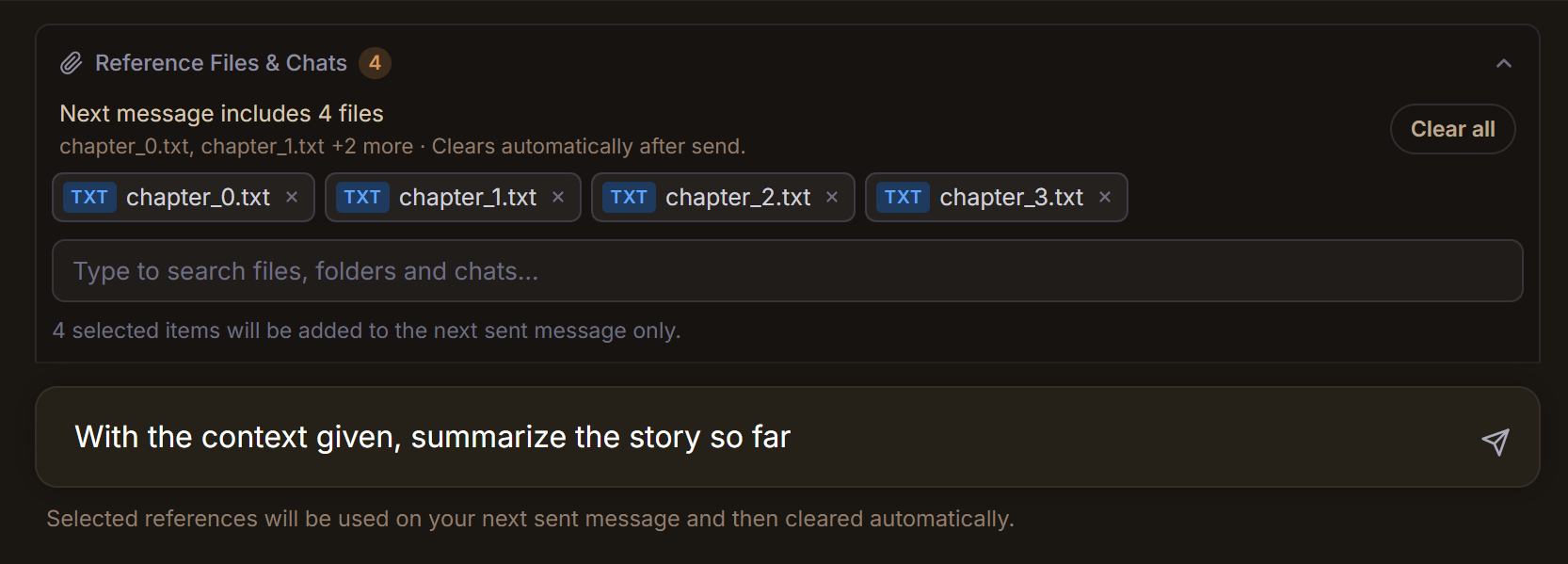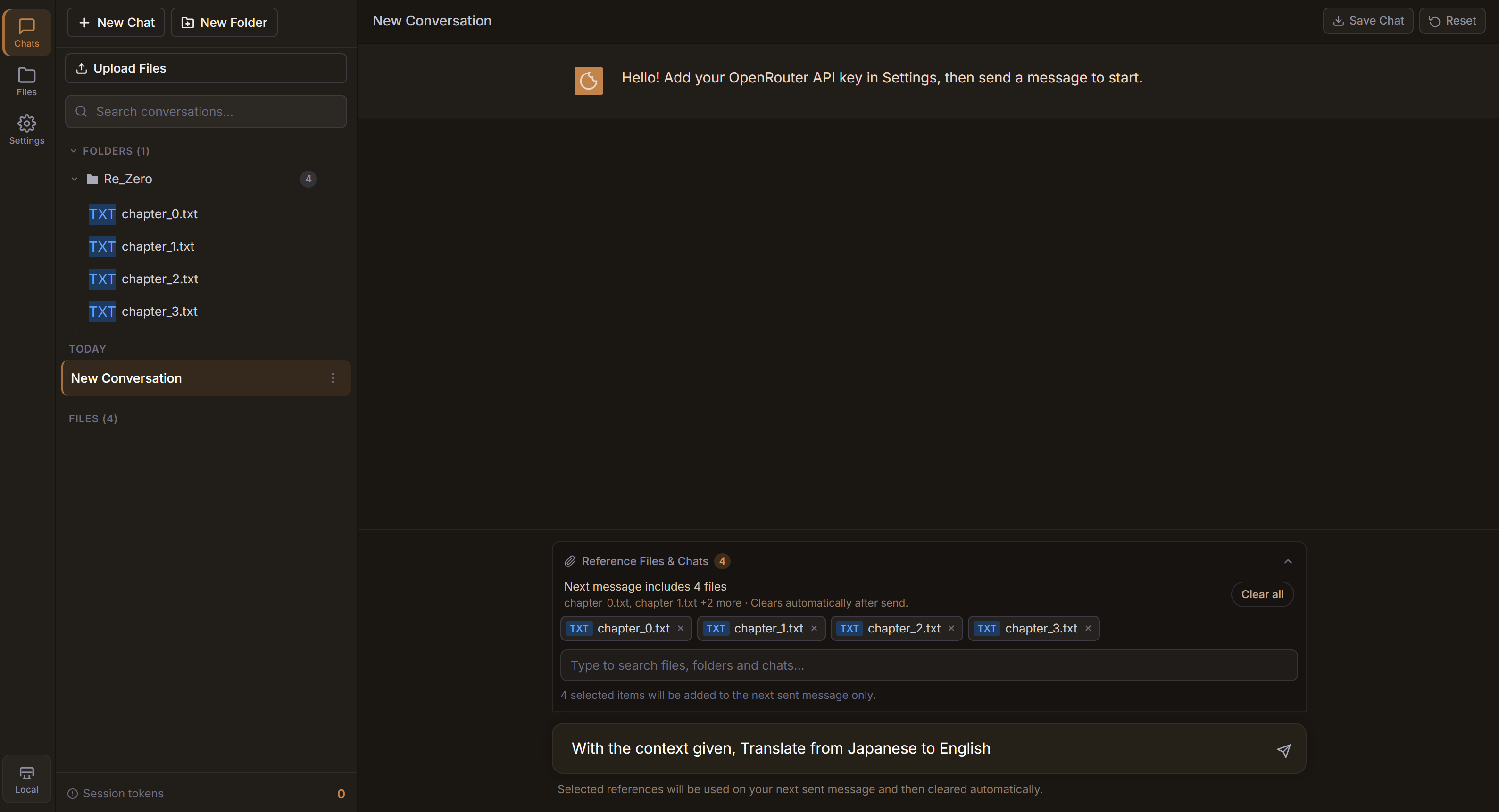 - Put chat, files (txt, epub, pdf), folders as context